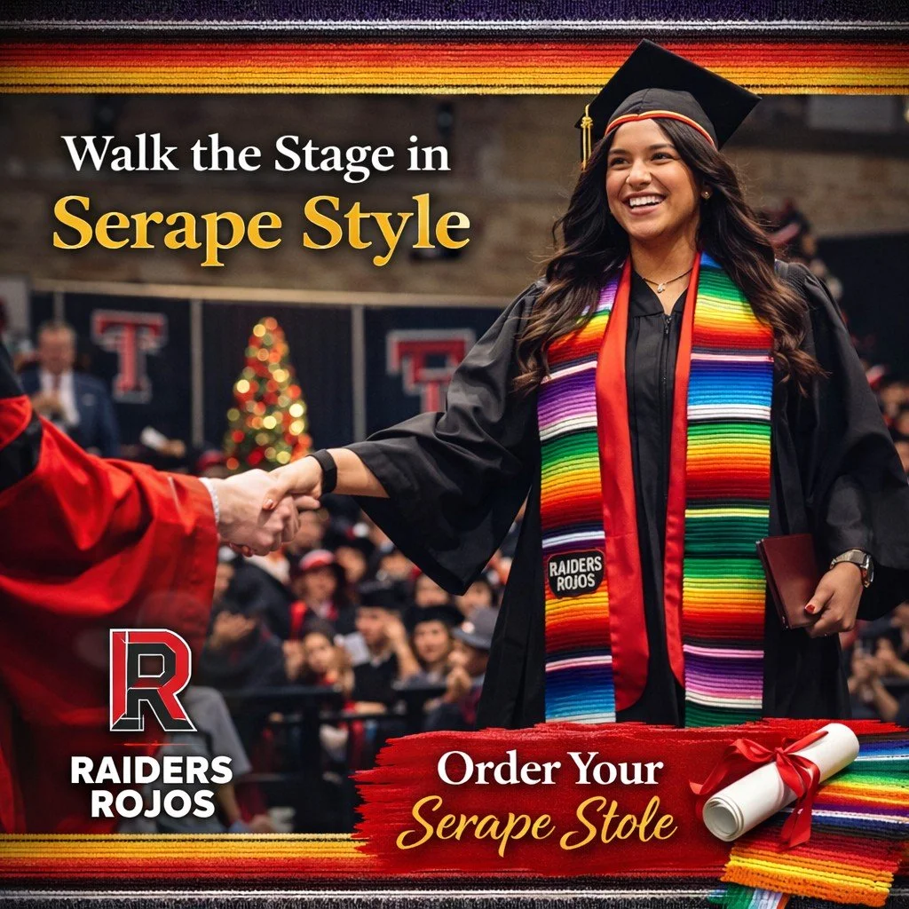 May 2026 Graduates who are not able to attend the Graduation Convocation, you are still able to purchase and schedule a pickup of your Serape Stole from the Raiders Rojos Off-Campus Offices. CLICK HERE to purchase.